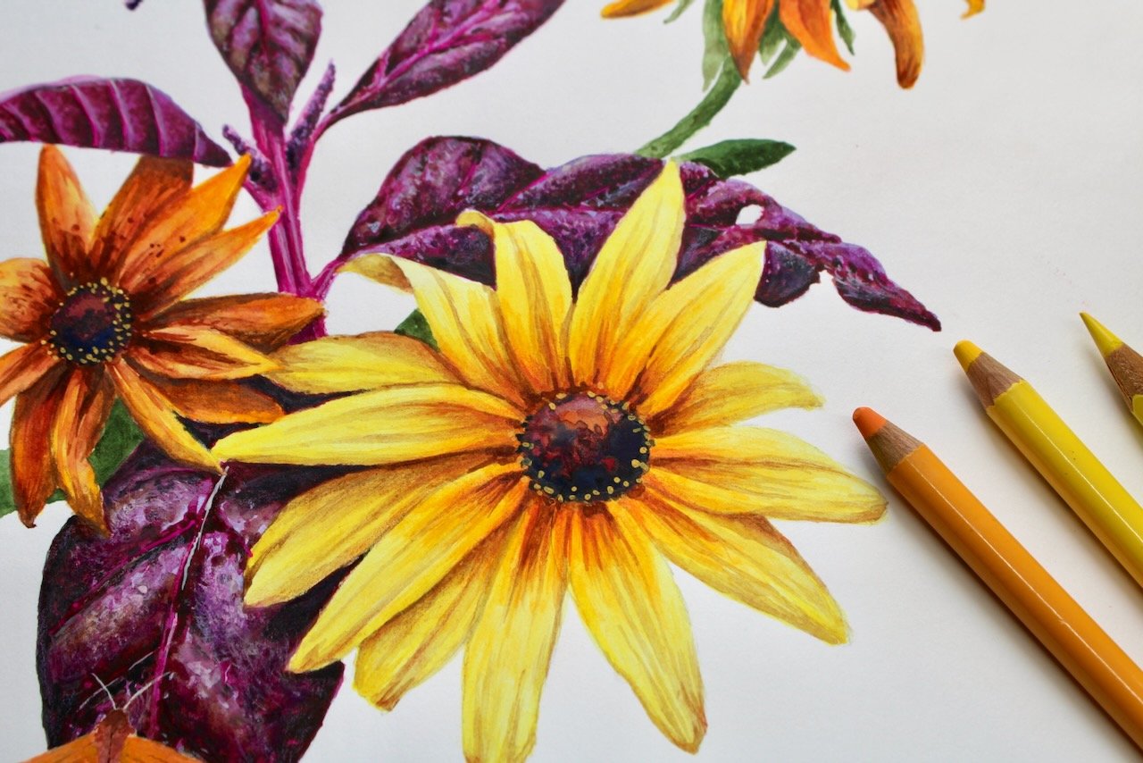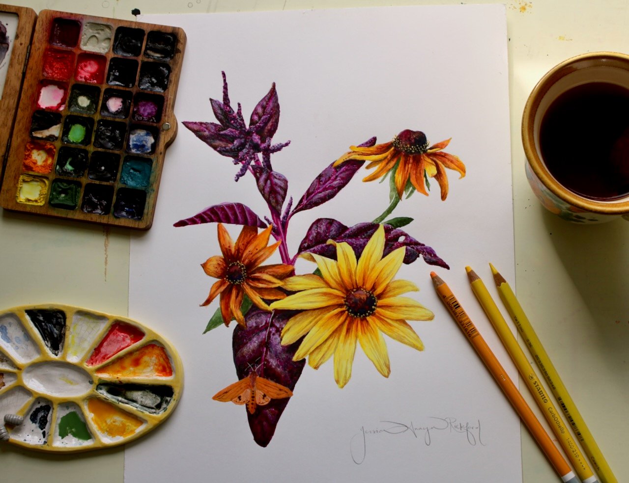 Rudbeckia and Amaranth painting with watercolor and colored pencil printed on archival paper in the highest quality.