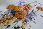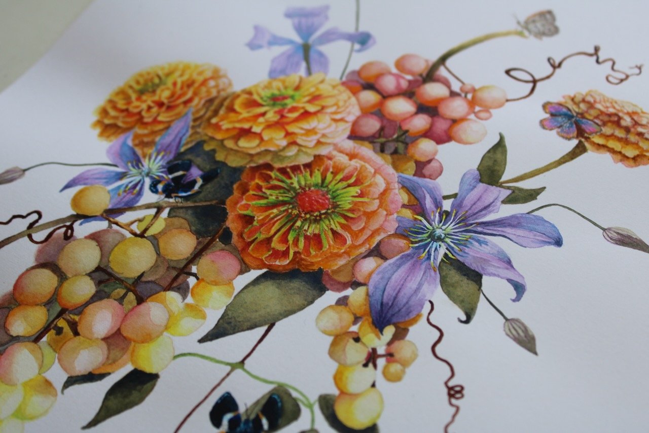 Zinnias, Clematis and Grapes painted with watercolor and printed on archival paper in the highest quality.