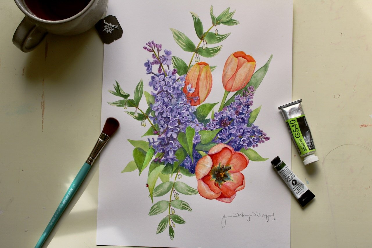 Tulips, Lilac and Solomans Seal painted with watercolor and gouache printed on archival paper in the highest quality.