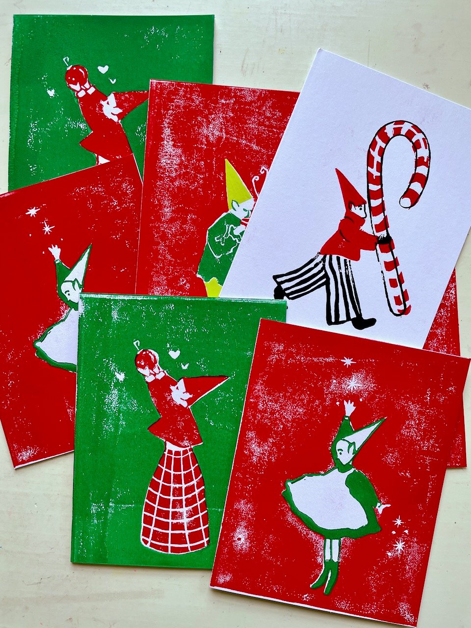 These cards are each hand printed with Linocut. Due to the handmade uniqueness of them, no two are the same and may posses small clues that no robots were involved in the making of these cards!
